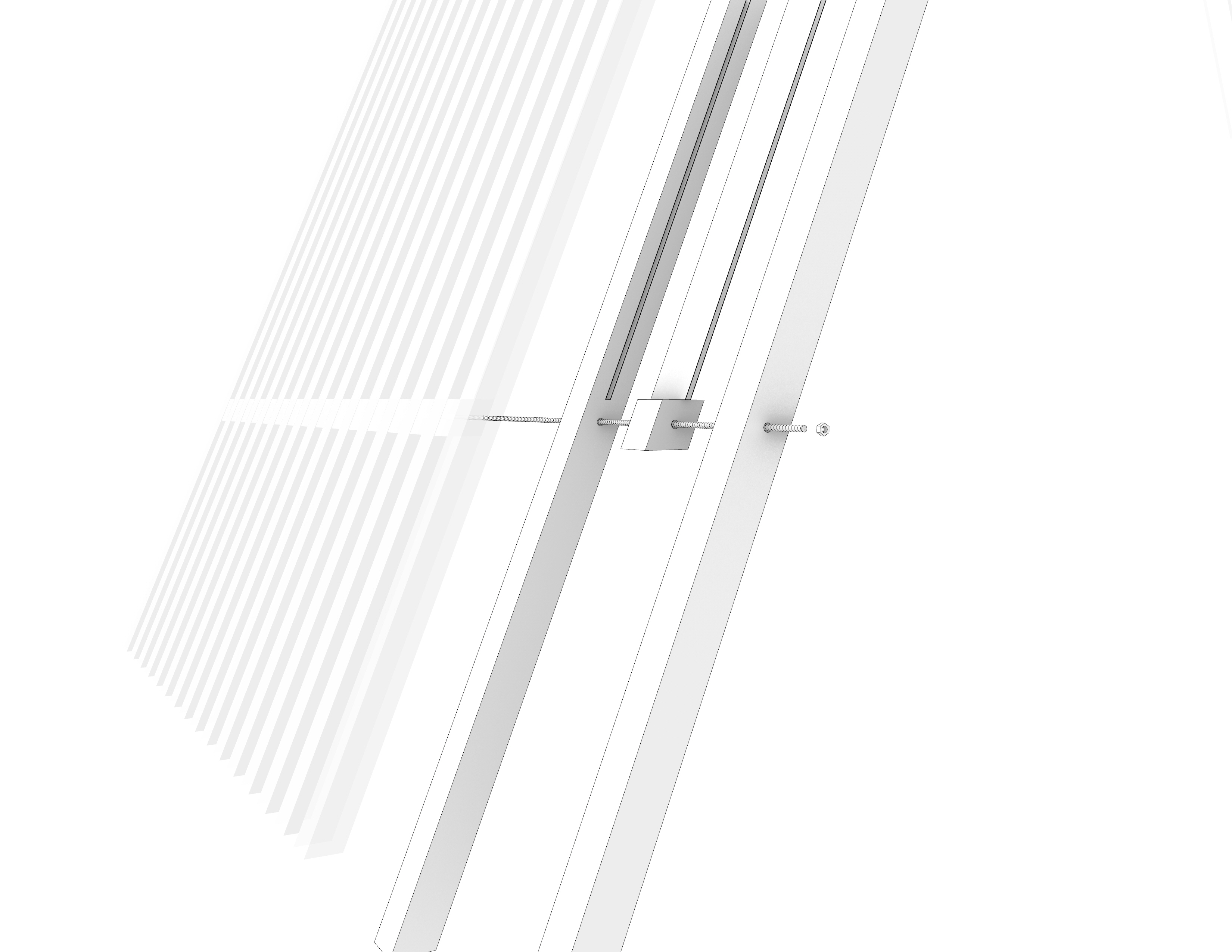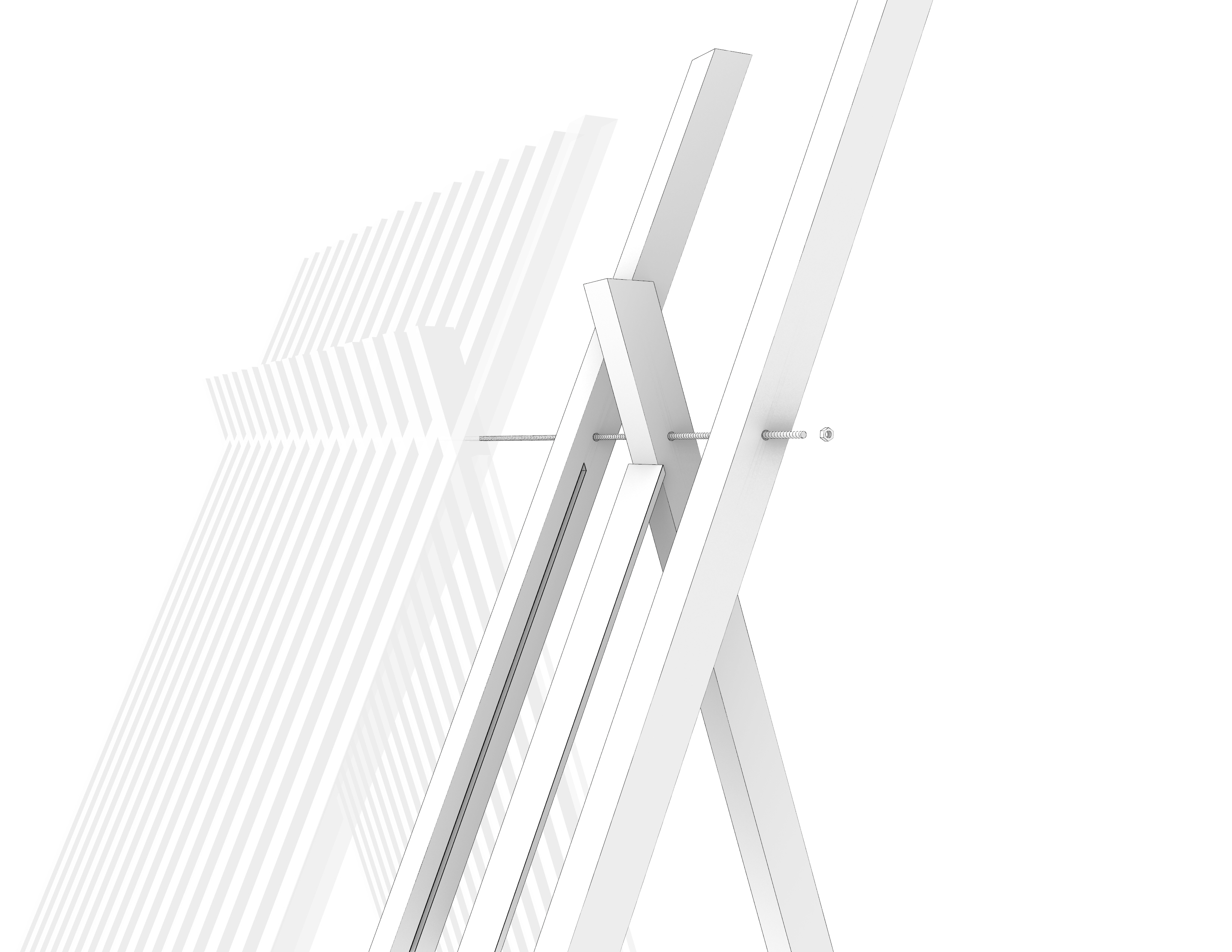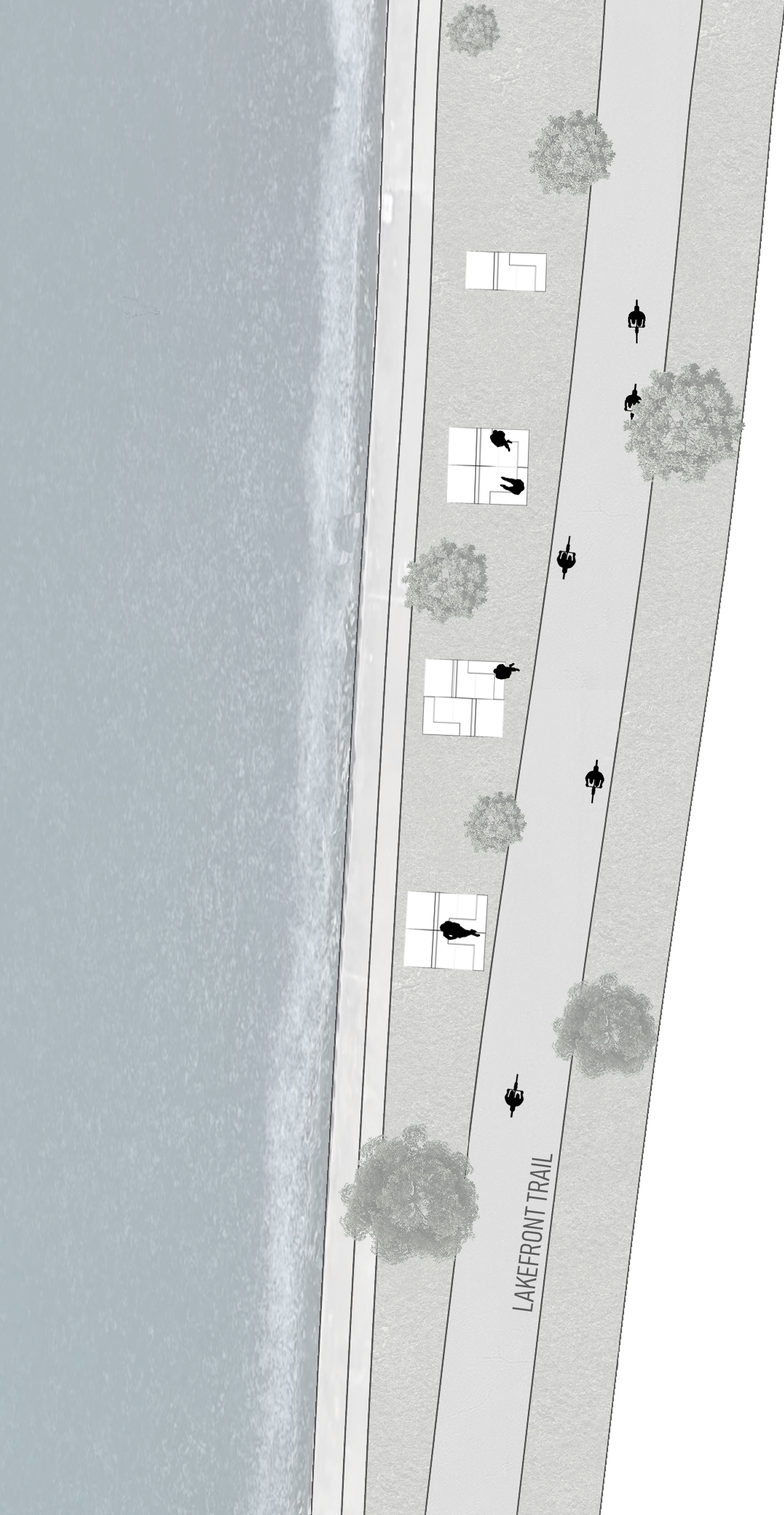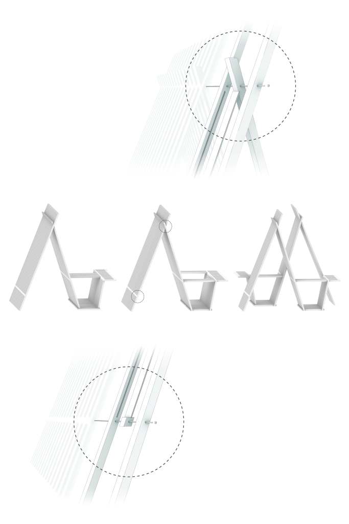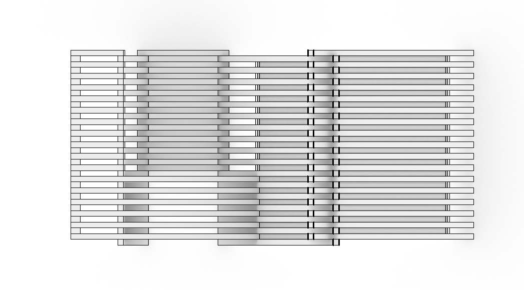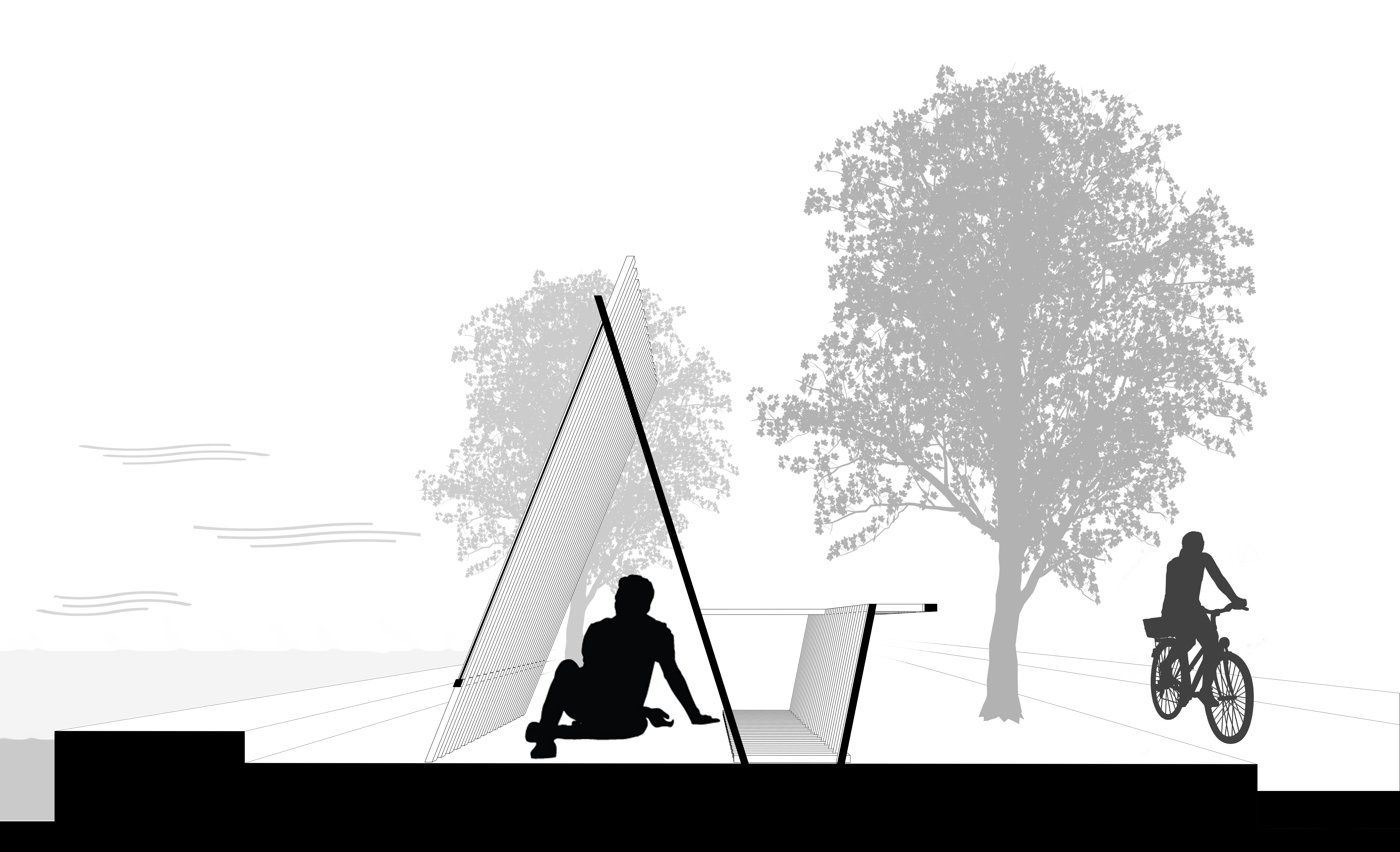 BreezeBREAK is a modular pavilion that aggregates along the Lakefront trail, a bike path that runs north to south along Lake Michigan. It functions as a rest stop if one needs to briefly catch their breath and avoid the wind. One module is a 4′ x 8′ structure that extends 8′ high with a “L” shaped bench that allows for a couple different ways to sit about it. The other half to the full pavilion is a mirror copy of that single module. Dependent on how they are arranged and oriented the full pavilion can take on a number of different forms, each with unique ways people are “suggested” to act about it. When constructing the drawings, I decided that I would make hybrid drawings, showing both the shade and shadow of a rendering and the linework of a more traditional drawing. I believe this helps read the depth of the plan and arrangement of members on the elevation. As for the parts and pieces diagram, I focused on showing the different organizations of the modules while also showing the assembly of two of the joints and how the second material (acrylic strips) are incorporated into the design.