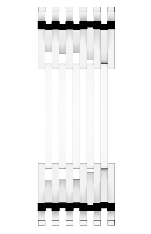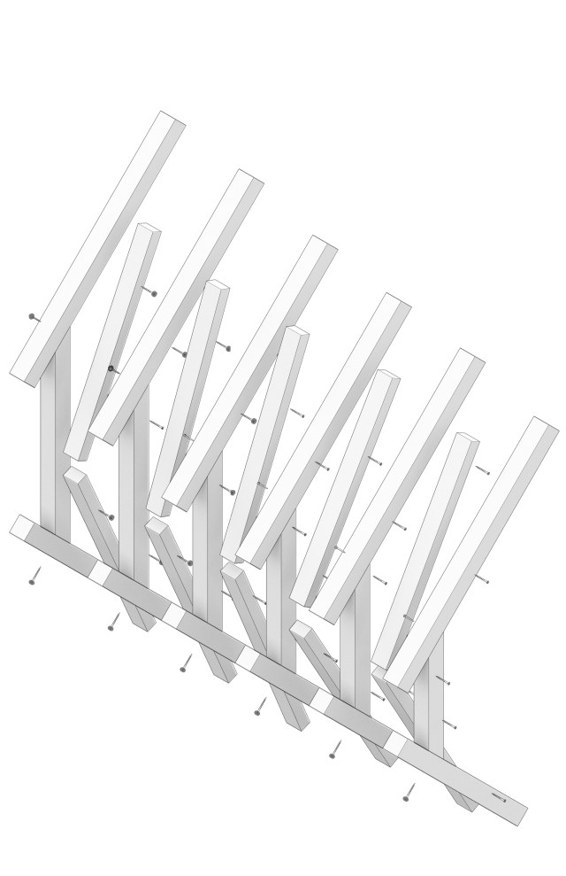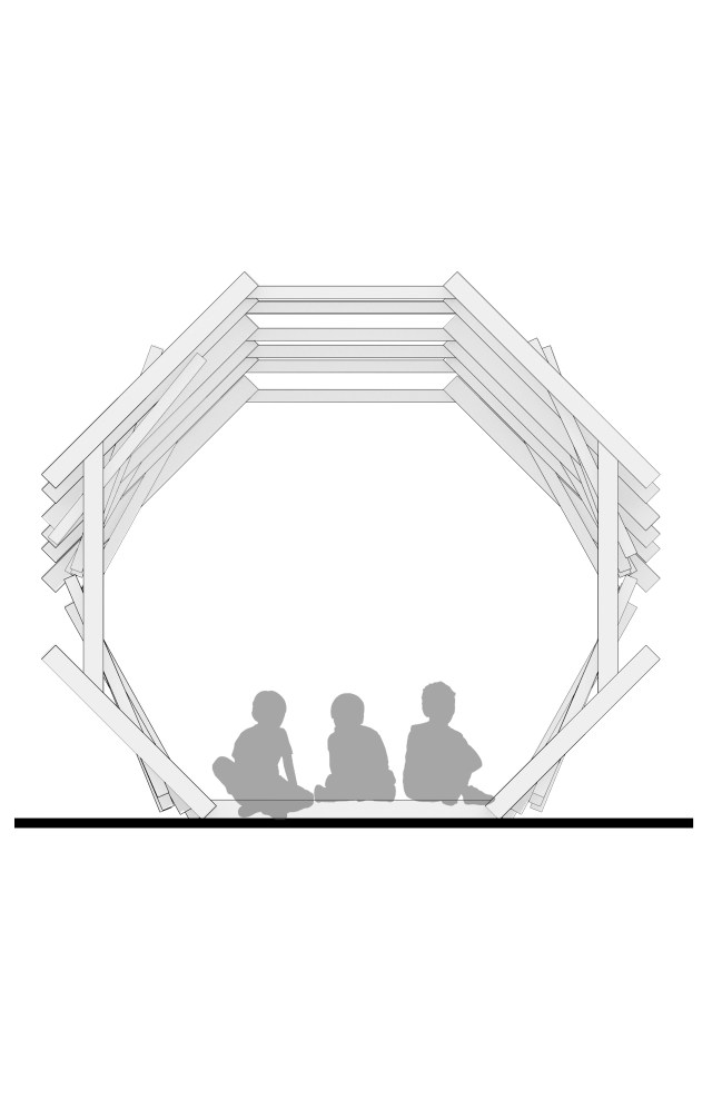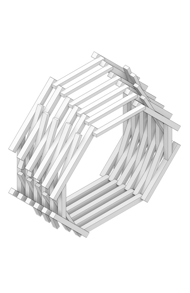 I added an axonometeric view from the back to pair the detailed view of how the joints and braces come together. The screws were well hidden from the inside in the construction of the pavilion. I felt this was best represented in the parts and pieces drawing with screws not disrupting the interior and only emphasizing the harsh exterior. The “sandwiching” of the joints and braces is also shown to give context of how the pavilion was constructed.
