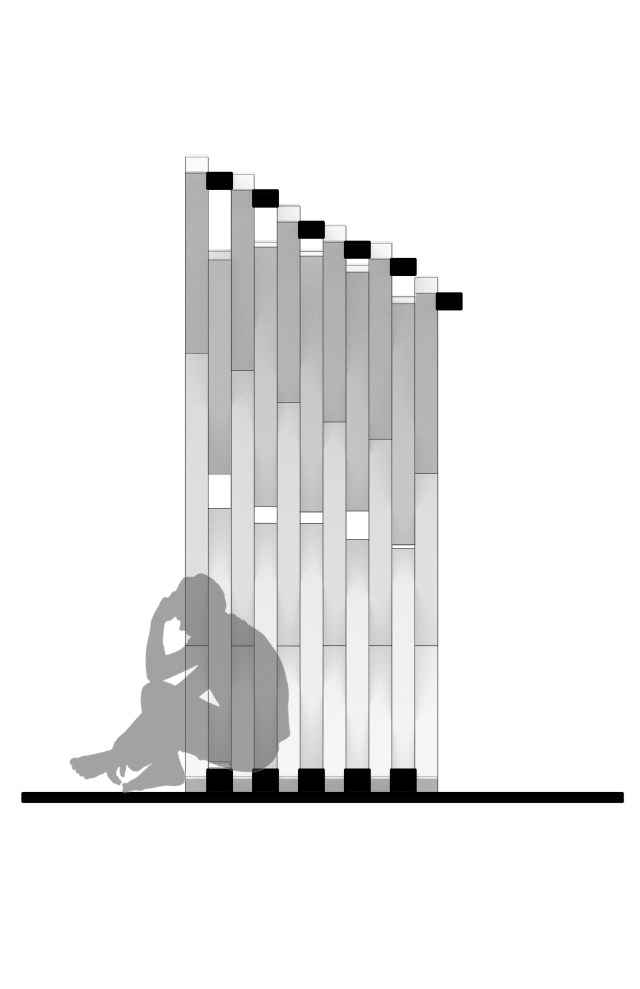 Translating through drawings was best shown in the side elevation, the front elevation, and the side section. I tried using shading through Rhino Rendering to create the harshness of the exterior and the softness of the interior. I used a hybrid technique of paring the line work over the Rhino rendering to establish a clear and concise drawing. My scale figures are shown occupying the space inside, thus reinforcing the idea of the safe space created by the pavilion.