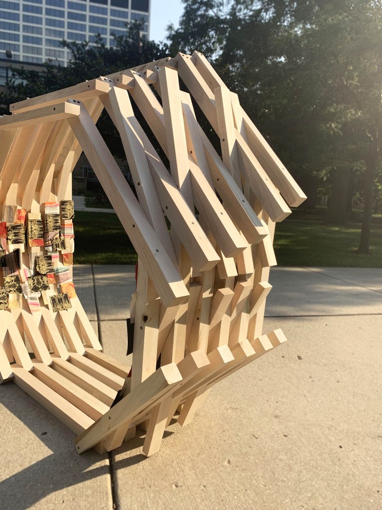 For our neighborhood, we designed a shelter that symbolizes protection against gun violence. The outside of the shelter is rigid and bold while the interior is soft and circular. The contrast between the outside and inside is inspired by two hands connecting.