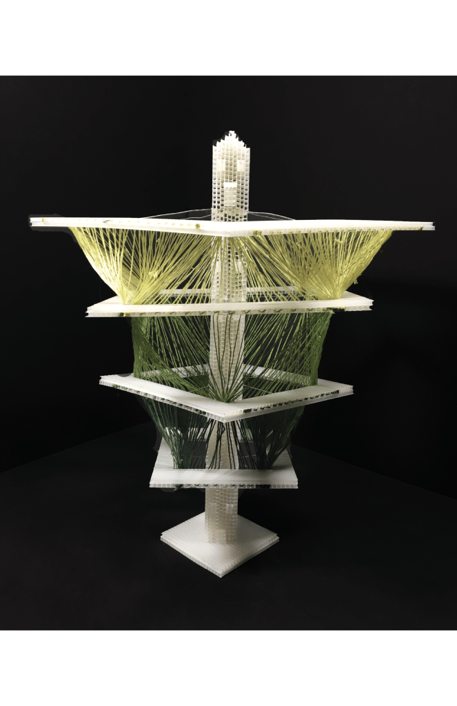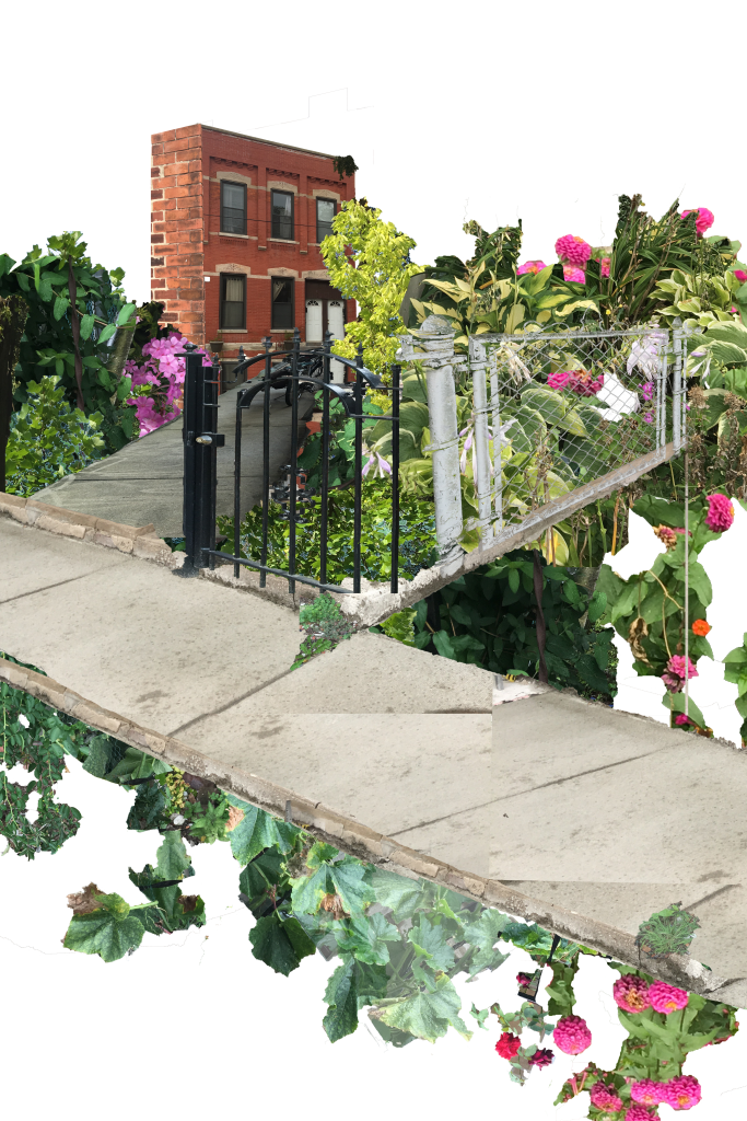 I explored the intersection of Wallace Street and West 32nd Street. I found the sunken gardens between the sidewalk and the buildings’ compelling. In my collage I captured how the sidewalk folds around the houses. Beginning as linear paths to walk along next to the houses, they then fold down along the sides to the paved bottoms of sunken level gardens and patios, and they wrap around the house, with the paved allies. In my collage, I used sidewalk images at changing perspectives to capture this, and suspended them on the page to be the ground plane. I pushed the vegetation down to create the sunken garden. The house sits far away exaggerating the size of the garden. The collage model expands on this exaggeration. String represents the garden, and clear plastic represents the man-made structures (house, and sidewalk). The sidewalk wraps around the central house and rotates as it descends to the base, or bottom of the garden. The thread garden fills in spaces between levels and can be seen through the plastic (sidewalk).