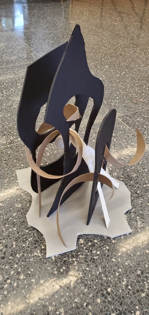 In my 3D model, I used the abstract method to represent the idea in my collage. I use the three elements of collage – cars, trees and facade – to show another sense of layersin a interlacing way.