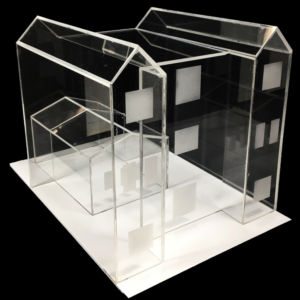 Furthering onto the model, I wanted to continue showing the contrast in size of the buildings and show how it affected the space. To execute this, I decided to create these two houses seen in my collage and place one within the other. I believe using acrylic as the material for my model, one is able to actually look inside both houses and compare and contrast the spaces of each.