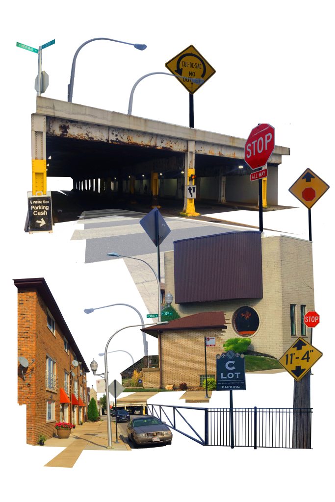 In my neighborhood, Canal Street & West 33rd Street, the most prominent architecture I noticed was the infrastructure. The Sox Stadium Parking was facing a row of houses, and all along the street there were road signs. The street came to a halt at the bridge with the CTA tracks. This led me to look at how infrastructure informed us about directionality. In my collage I played with perspectives and created a visual path through the placements of the pictures. The use of the street signs helped me in adding directionality to my collage.