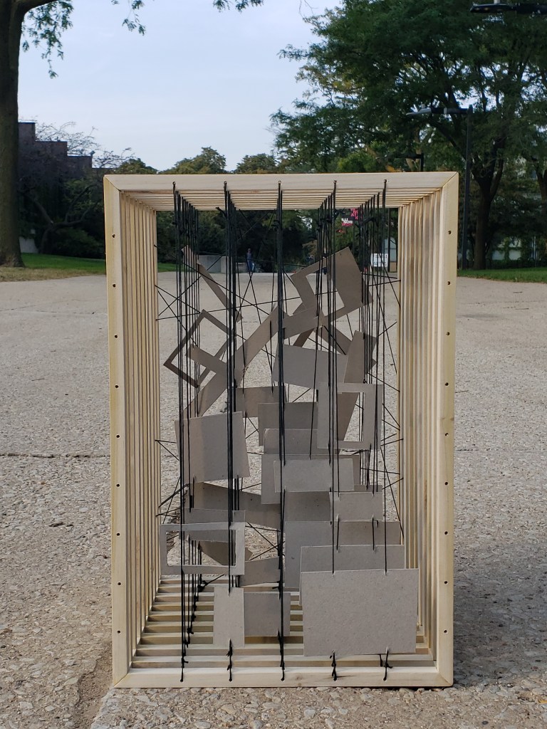 At the intersection at 33rd and Princeton, what caught my eye were the differences between what lies north, and what lies south of the area. If you look through a certain alley, you can catch a glimpse of the Chicago skyline which represents a busy, urban space that contrasts with the neighborhood of Bridgeport. If you look south you will see Armor Square Park, as well as the White Sox Field. I decided to represent this contrast of north and south in my collage. Different aspects of each area, like distinct shapes, how compact and dense the spaces are, and the scale of the masses were all considered and represented in both collages.