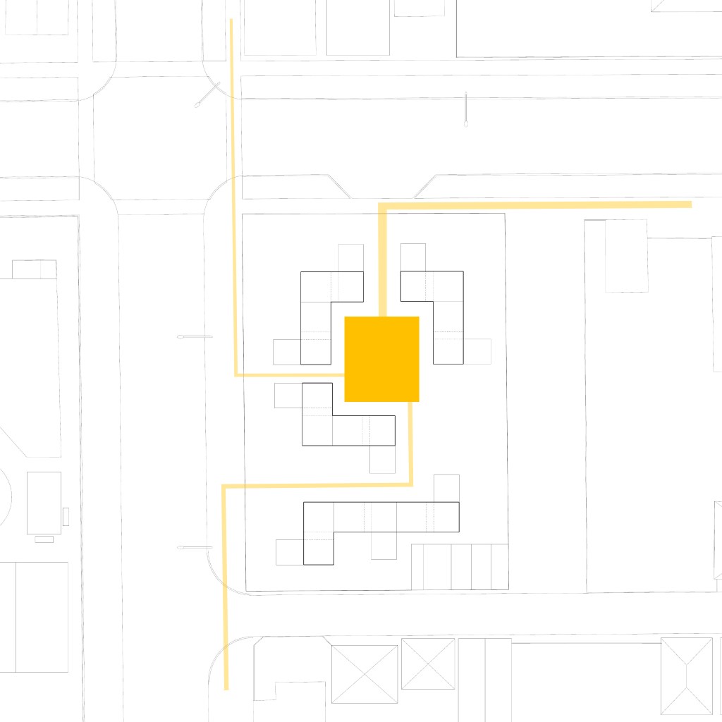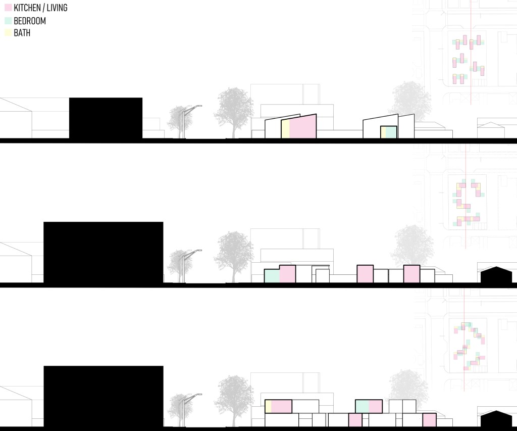 Site sections show the relationship of the different massing on the site and also the relationship of the different unit programs to one another.