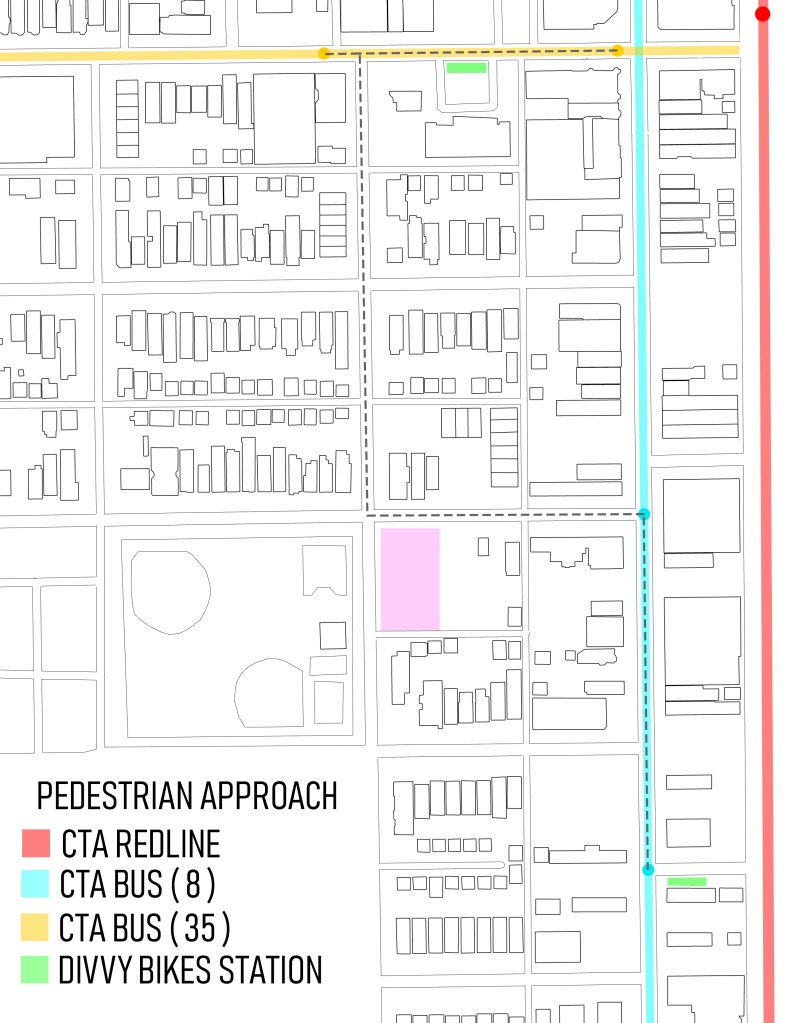 One of the unique conditions that I’ve found about the circulation about the site was that it is much more accessible by public transportation. This is because of the network of one way streets that restrict mobility through the vehicular approach. The pedestrian approach has many options and every stop or node of access is no further than two blocks away.