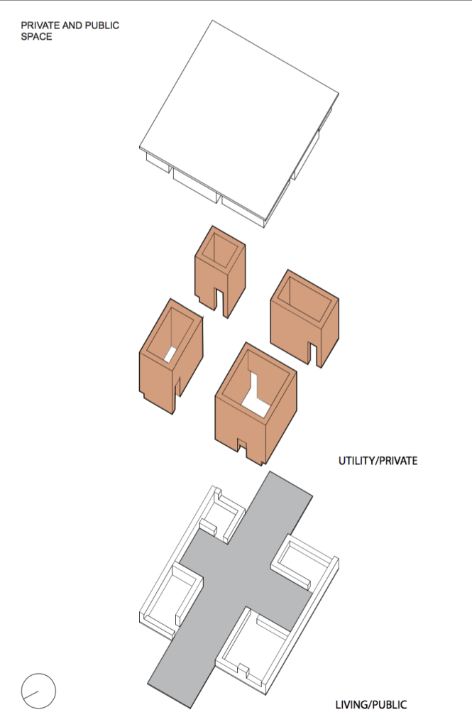 - Grouping utilities at the corners of the home in enclosed spaces to make wiring and plumbing easier and open up the center of the home for open living space. This is in contrast to grouping utilities in the center of the home.