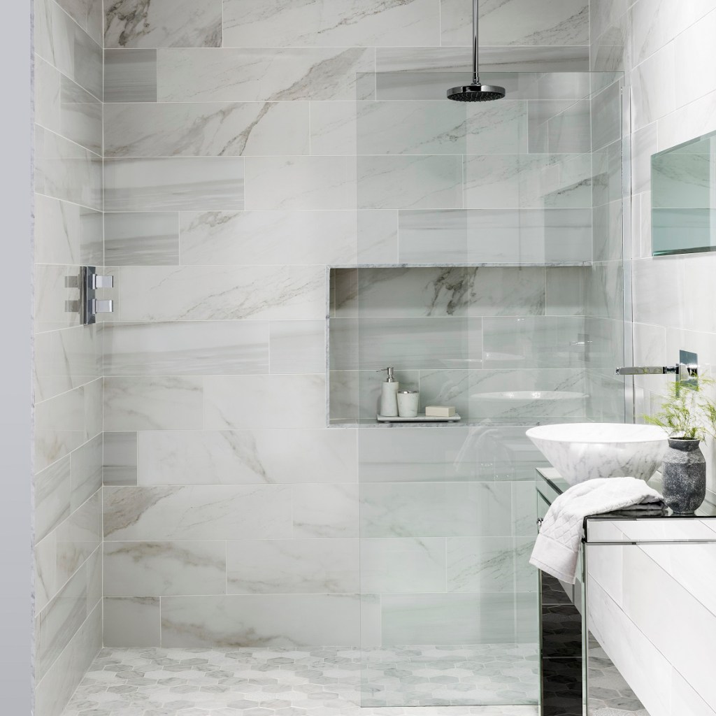 Back-splash in the kitchen connects with the wall cabinets that are also plexwood. Back-splash and bathroom walls are covered with white tiles.
