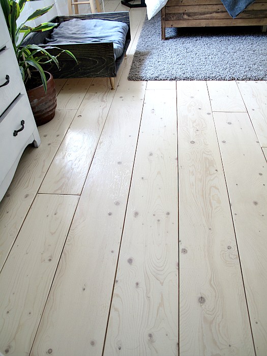 The floors are all made of white stained plywood except the bathroom, which is marble tiling.