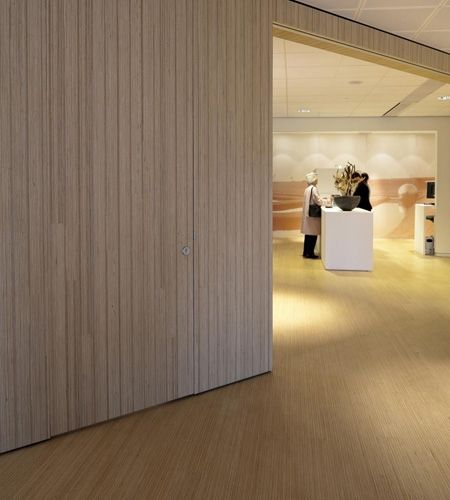 Interior walls are made of plexwood because of the materials flexibility and adaptability to curved surfaces. It creates a warm look while adding verticality to it.