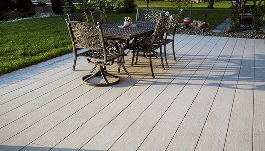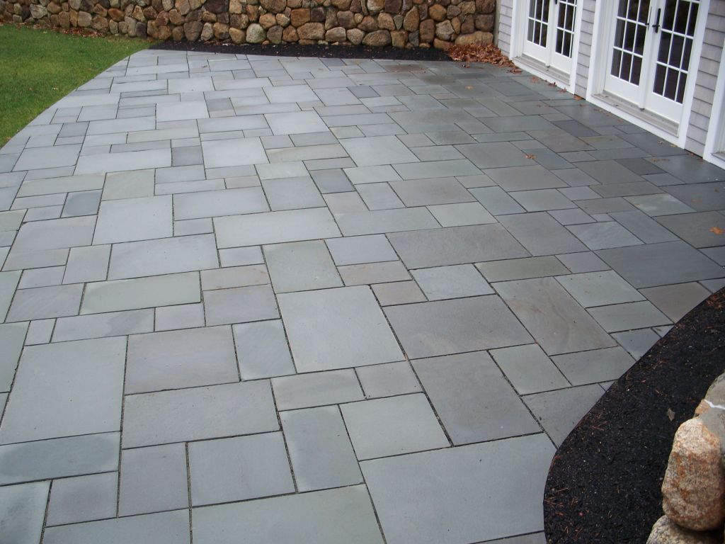 Glass windows with metal frames, white stucco exterior and PVC membrane roof. Terrace is and patio is wood and walkway on the site is made of bluestone pavers.