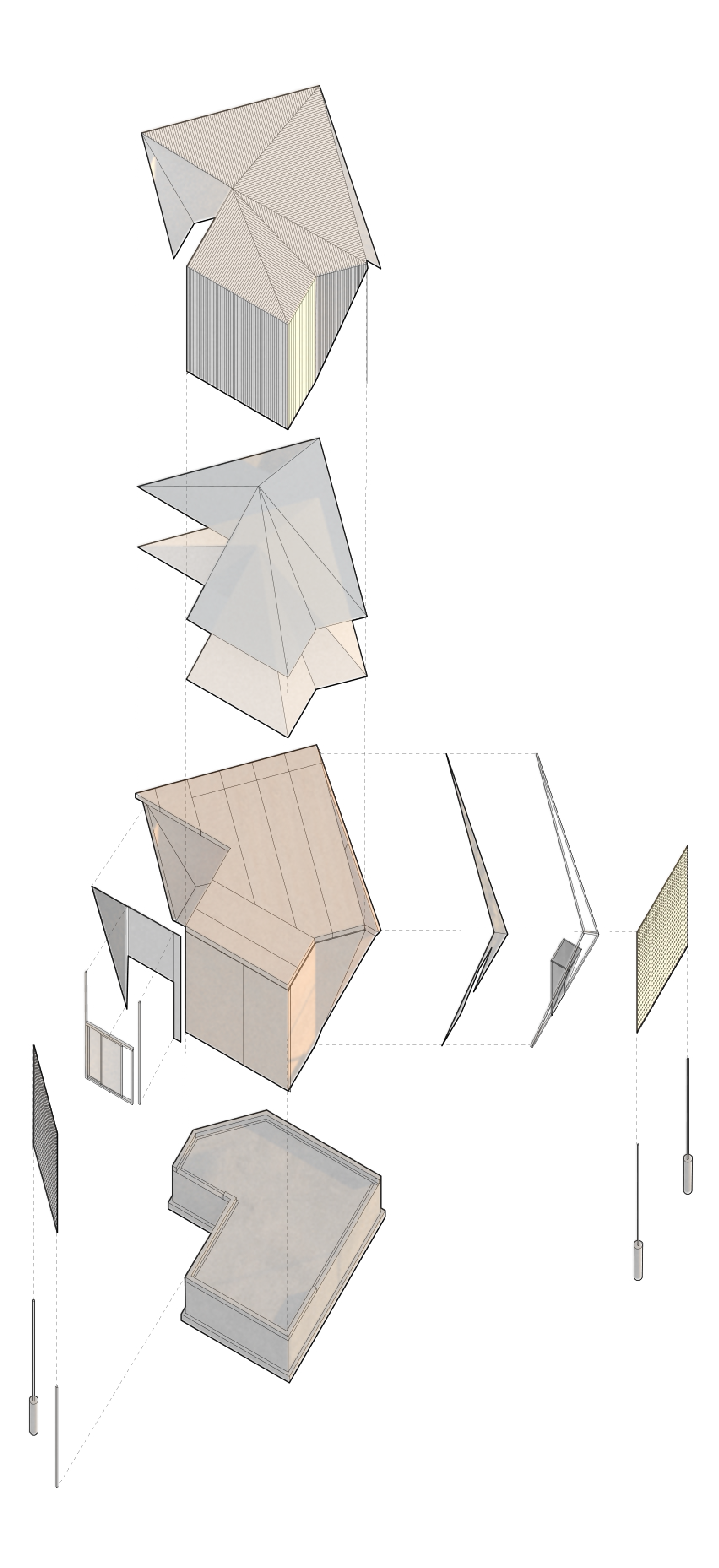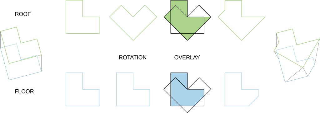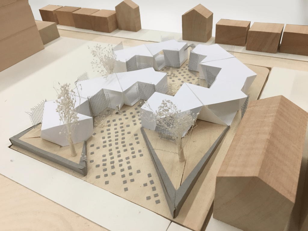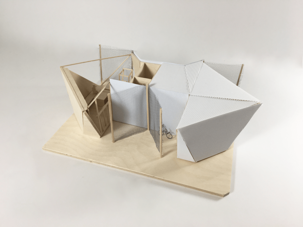 My concept grew out of studies of my collage model, inspired by the folding and perspective views of sidewalks wrapping around the gardens of Bridgeport homes. My form came from my collage model’s rotation. I began with a folded rectilinear home and rotated the roof, and then adjusted the walls to bridge the offset planes.