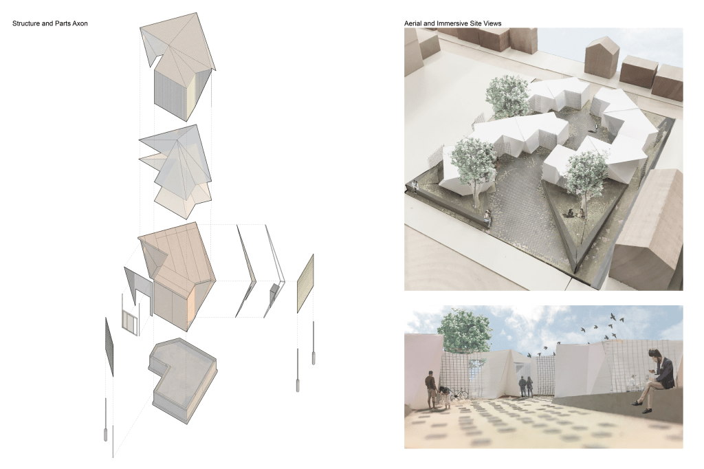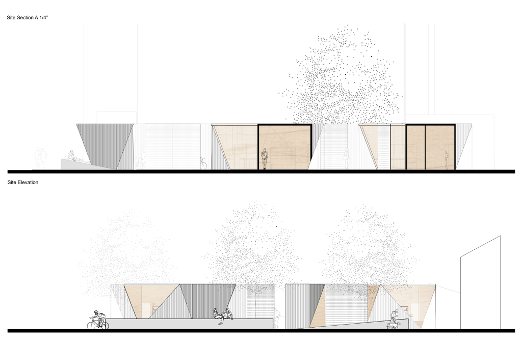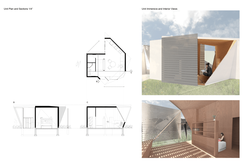 My tiny house community focuses on the contrast between the experience of a warm, expansive, and open interior and a private site aggregation in an urban environment.