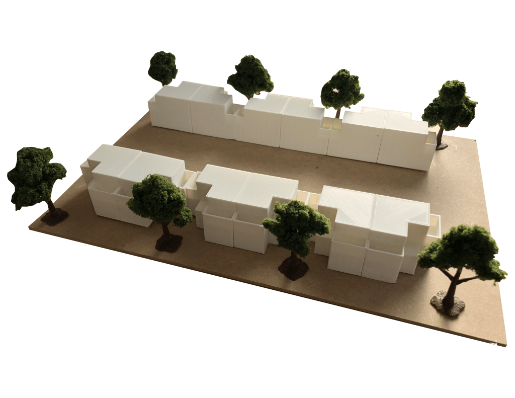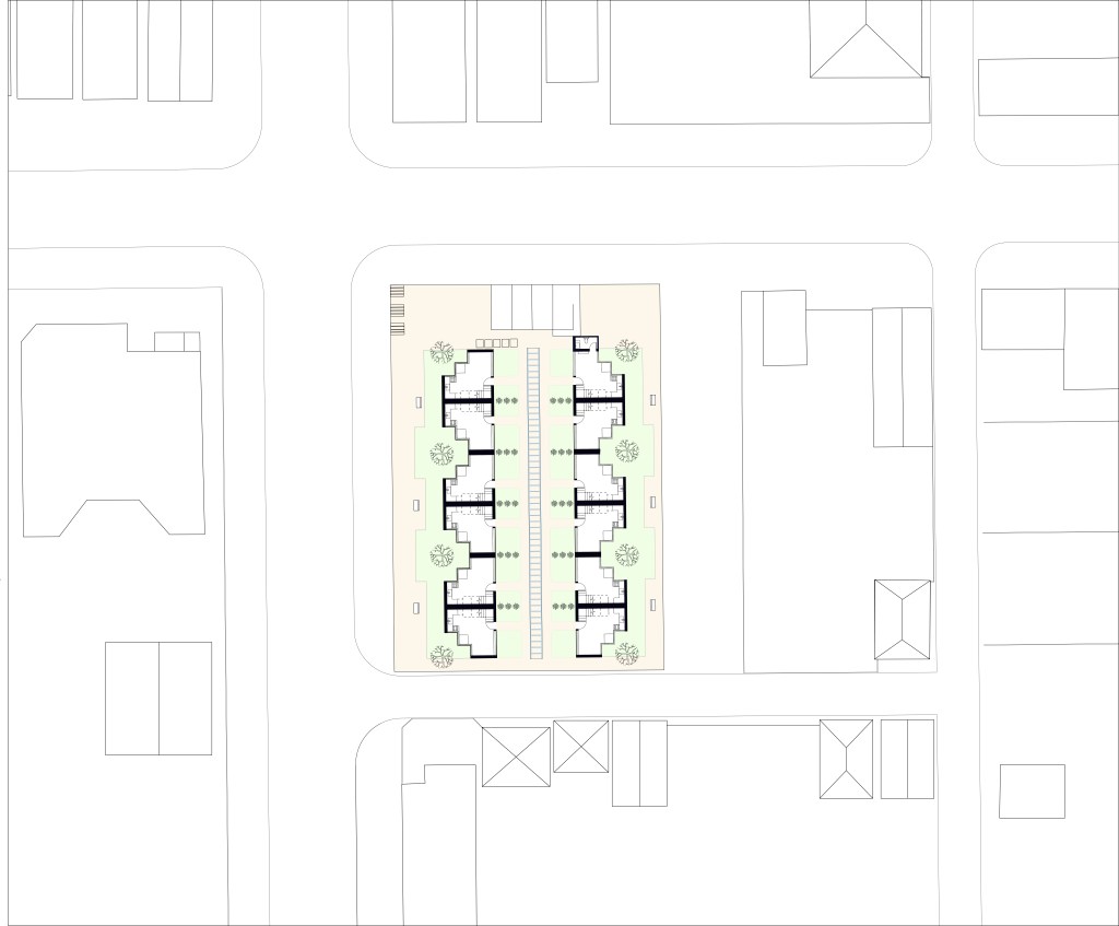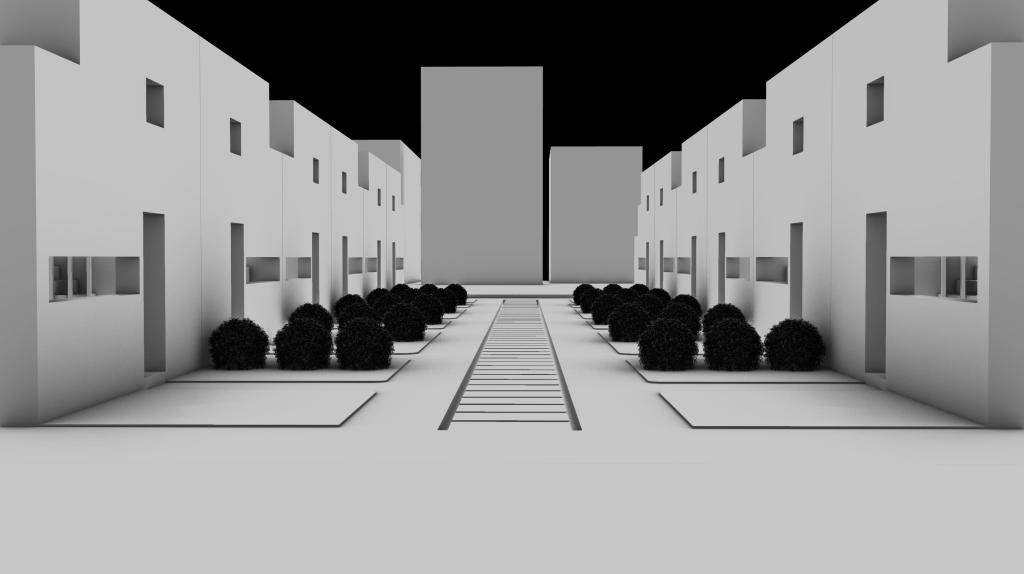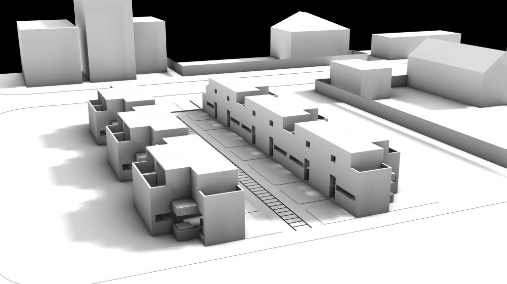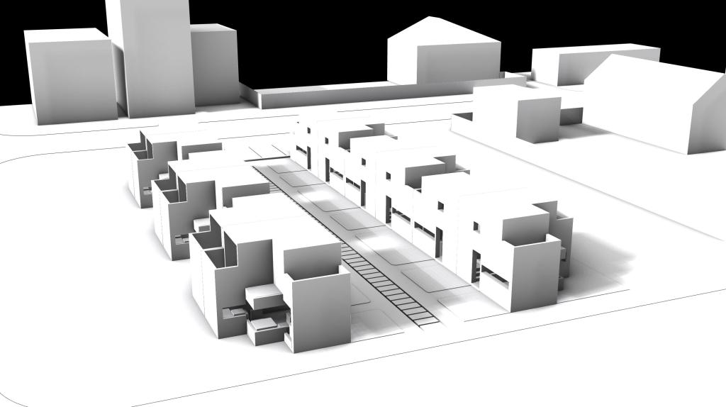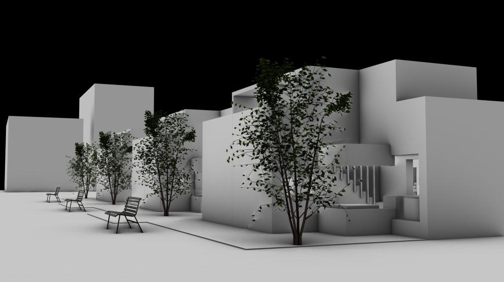 The XS Tiny House was inspired by the collage which is in an intersection between 32nd Street and S union Ave. I found out that the windows are unique and beautiful over there and the focus of my project is the window and how private and public spaces are balanced. In each unit I divided public space into the first floor and the private space into the second floor, and also I placed a lot of windows, especially large window into the first floor, so that people who lives on the first floor is easy to know what is going on outside. I used grid as the circulation for my aggregation because I want to create a community space in the center and each side of path (community space) will aline straight so that each unit can get same amount of sunlight at the same time. In the outer side of the unit, because it arounds with long window, in order to keep some private, I placed threes between each unit to block view. I also placed some bush between two near unit to divided them into separate spaces. Three important aspects of my design are the aspect (shape) of the unit, the shape of big window on the first floor, and the different shape of the first and the second floor.