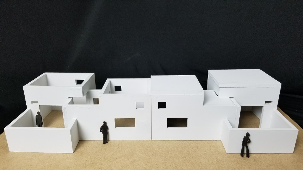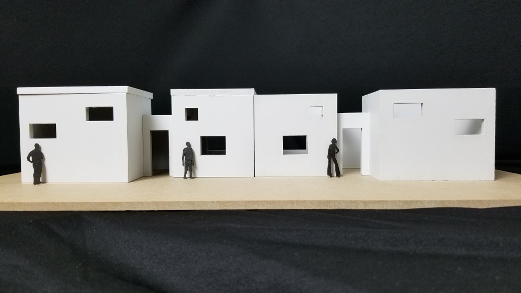 The concept for the house started off with the idea of street signs. As an architectural element, street signs are very undermined but serve a very important purpose. They ultimately control the circulation of people, traffic, and other architectural elements. The shape of the house is focused on two main large spaces (living/bedroom and kitchen/dining room) which are the locations that are the most important for gathering and symbolize the signs. The linear circulation is controlled by the central hallway that acts as the post/beam. The windows follow a similar rule by using the shape of the street sign connected to another one by a pole, and the heights of the windows are determined by the privacy of each room to the outside. The site is regulated by the unique pushing and pulling shape that the outline of a street sign creates. The aggregation of the units also correlates to this shape and is also altered for the best sunlight.