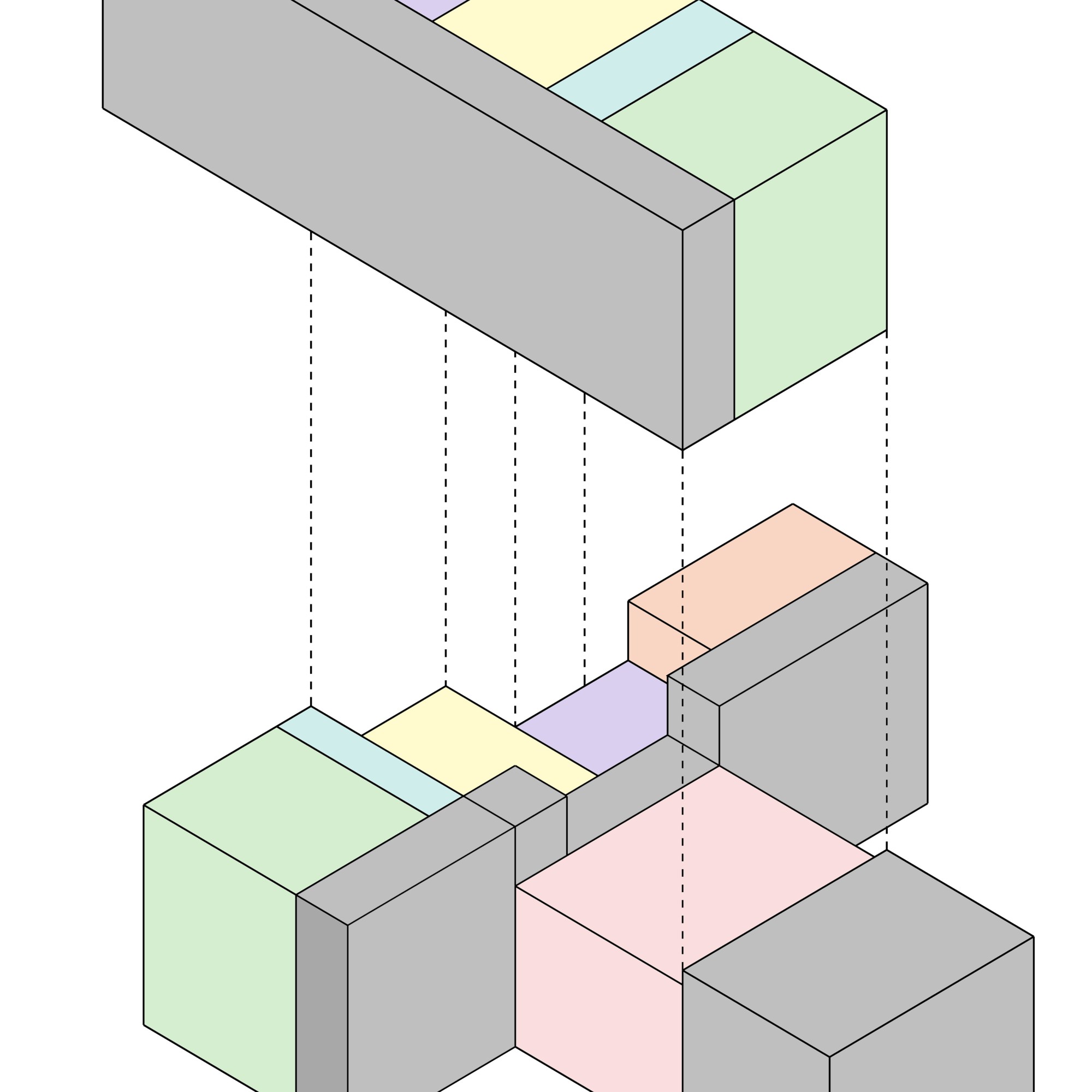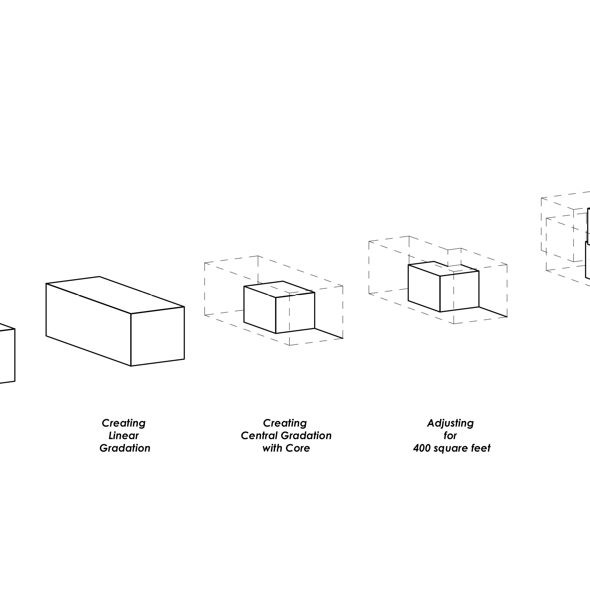 The main concept stemming from my 2D collage was an idea of a gradation. This transferred over to my 3D collage model with a language intersecting horizontal and vertical planes. Continuing the idea of gradation in my unit I decided to express that through different ceilings heights. A central core adds a central gradation from the exterior to the interior spaces which is achieved by a change in ceiling height from 12’ to 7.5’. The stacking of units is introduced to continue the language of intersecting planes used in my collage model.