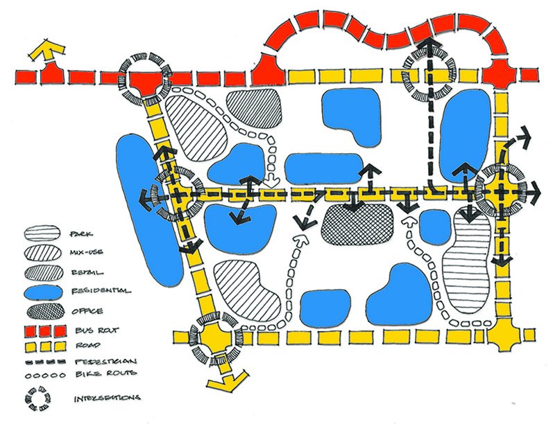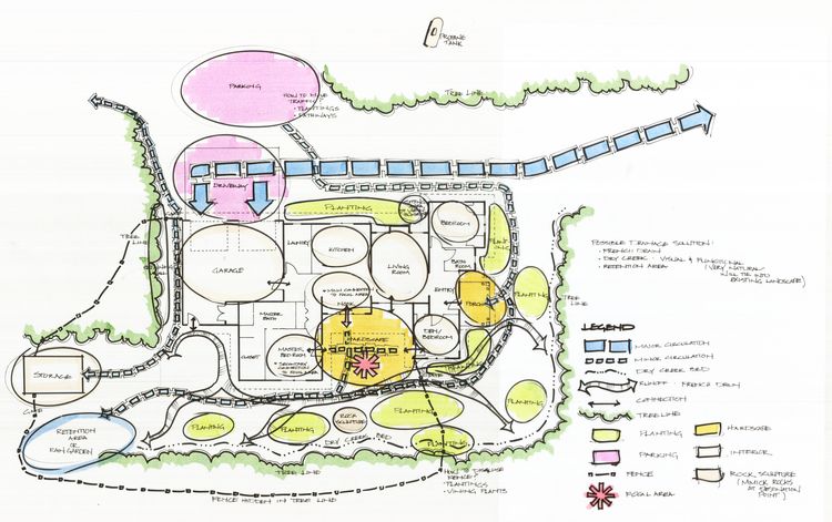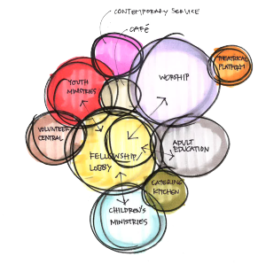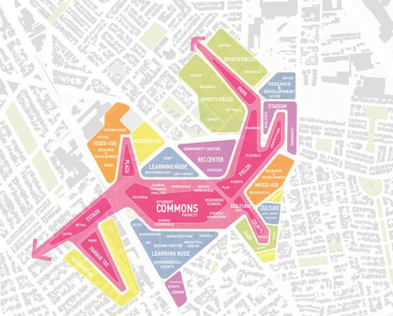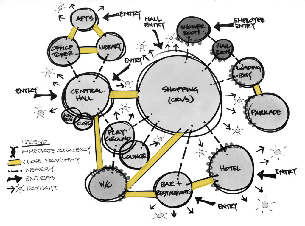 In their basic form these can be fairly abstract diagrams (like the bubble diagram above). But they can also incorporate additional layers of information, ranging from the the “sizes” of different programs to their overlaps and relationships to other elements or characteristics of a site.