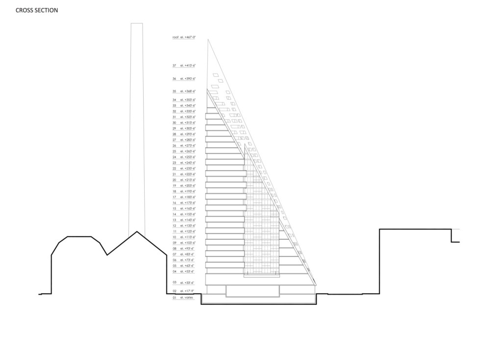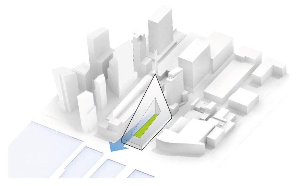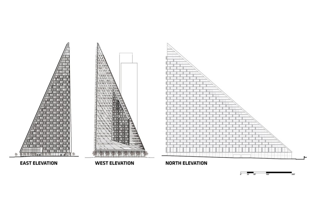 Merge- The triangular structure has been described as a merge between “European perimeter block” and ” Traditional Manhattan high rise”.