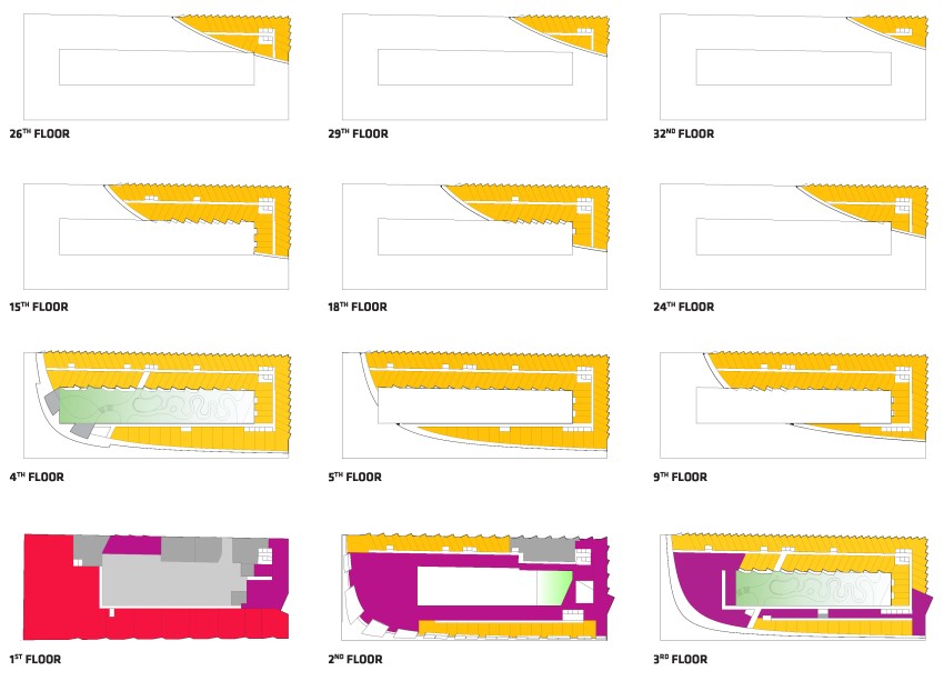 I’m also interested in more of the unexplained details of the project: looking at the color-coded plans can you identify the specific programs corresponding to each color and similarly color code a section. I’m also hoping that there are drawings at a larger scale that show the non-residential spaces at the base of the building and the nature of a unit or a grouping of units in plan and section. (For this you may need to find the associated architect or “architect of record” for the project as they may have been responsible for the actual unit design. With this additional documentation, will you show graphically in diagram form: