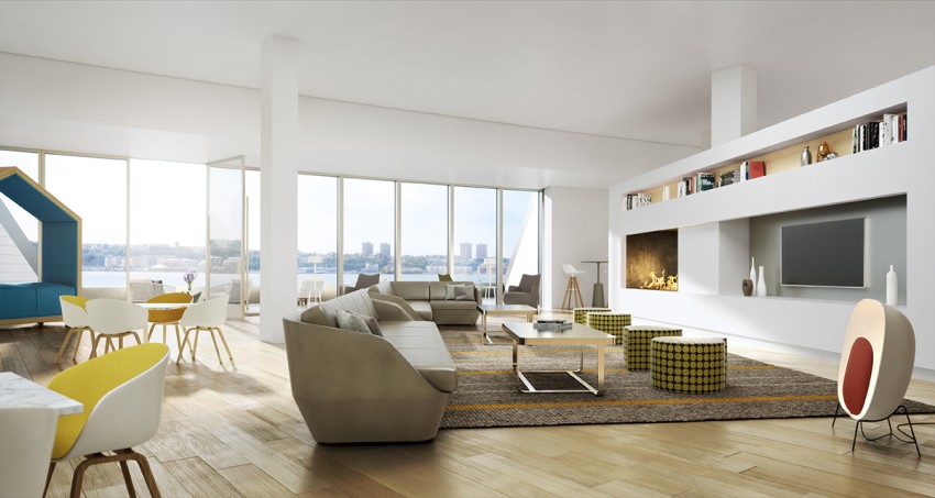 What we find Interesting: The most interesting part of Via 57 West is the Sail boat appearance created by the steep slope from the north east corner. The steep slope roofing creates a connection in scale between the lower structures of the building in the south and the higher floors in the north and west of the site. The bright grey metal cladding of the roof forms a perforated pattern, which is interrupted by openings that act as balconies facing the south. The building is very environmental friendly for example- It reduces the traffic noise and provides beautiful views of the Hudson River.