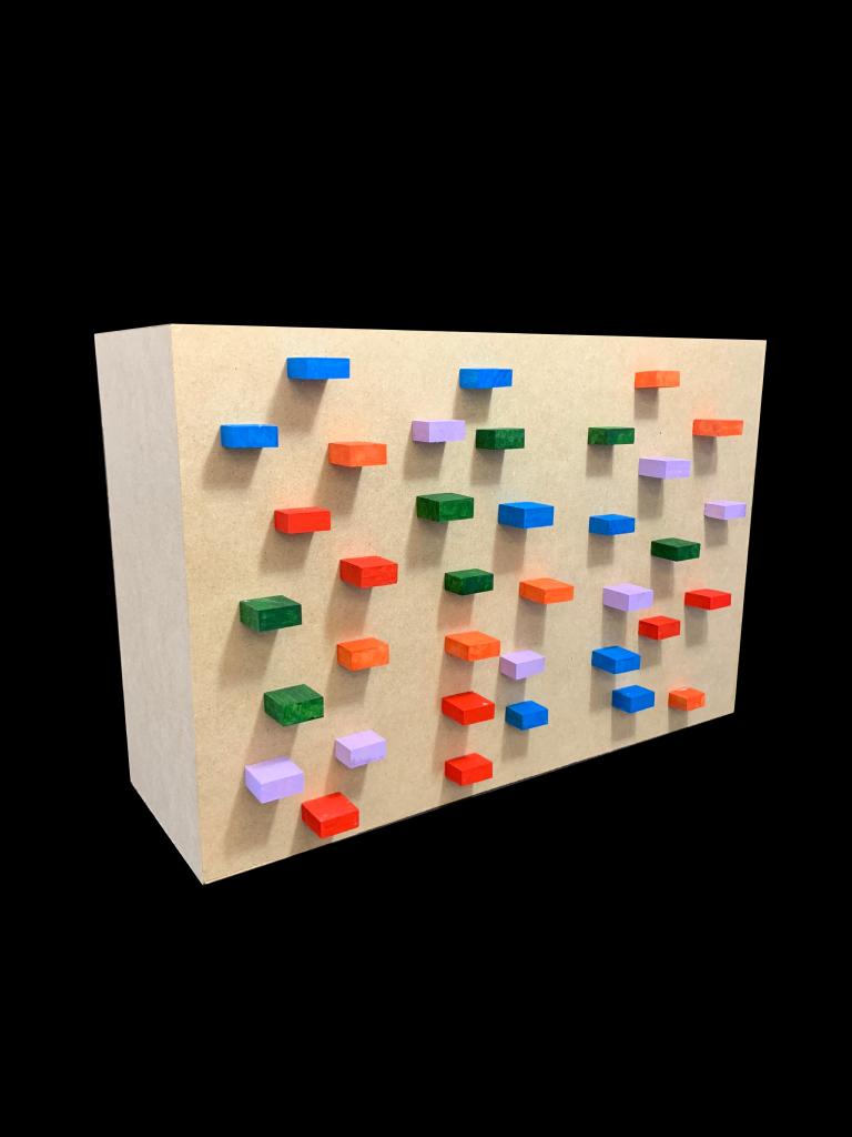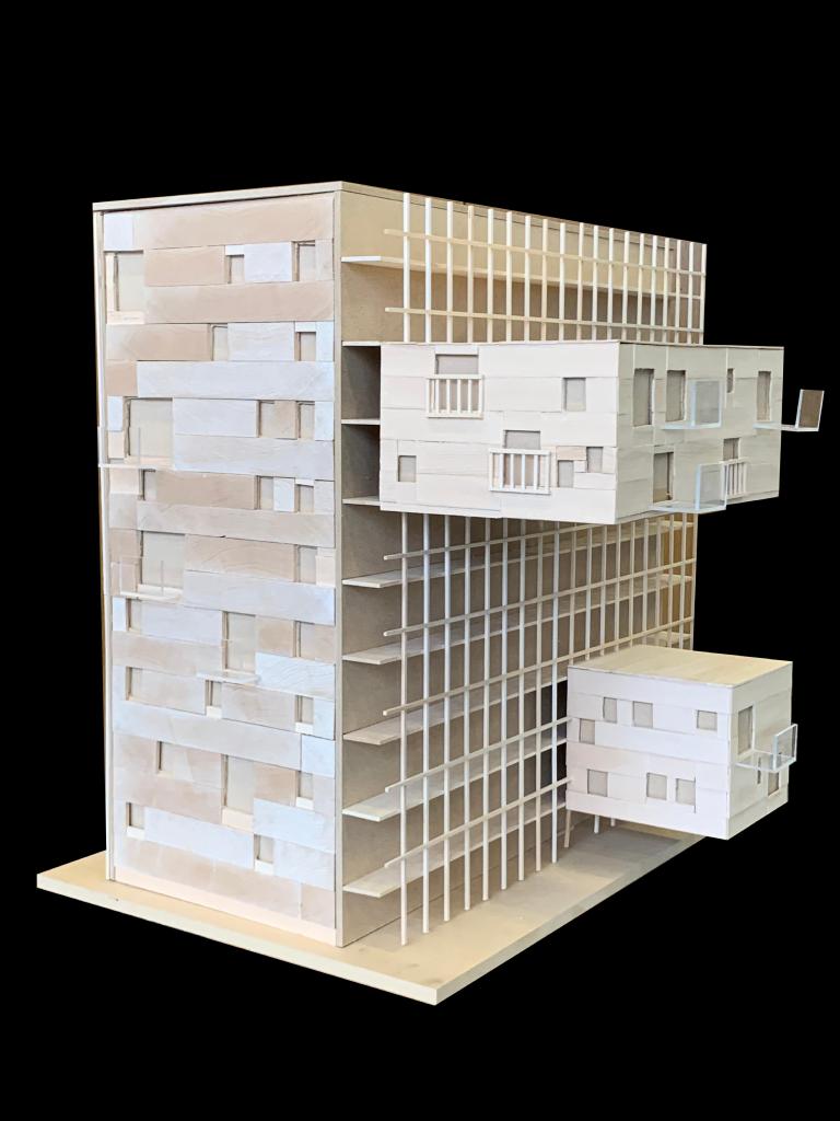 For this concept model we emphasized the modularity and repetition of each unit. Each unit is very similar in layout, so by bundling blocks of wood to represent how each unit stacks and creates one rectilinear form, with the exception of the cantilevered units.