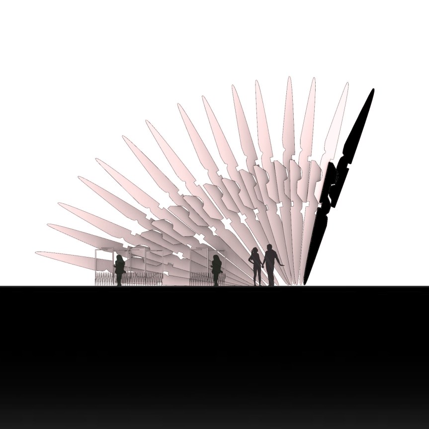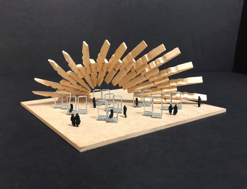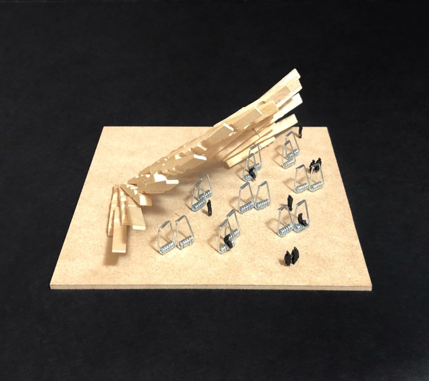 Clothespins Model Process: In my studies I had a strong idea that I need to split clothespins apart and then work with all parts separately. By doing so I ended up with an arched enclosed surface that navigates the facing direction. In that way I was able to establish a concept of gathering.