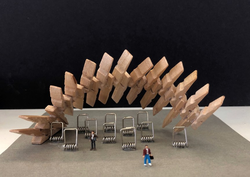 In the clothespins model my shared word is gather. It is gather because the cloth pins structure creates a space that navigates the direction in which a person has to seat and at the same time it is kind off enclosed. In that way the concept of gathering where people are forced to speak with one another can be highly readable because of the space that is created.