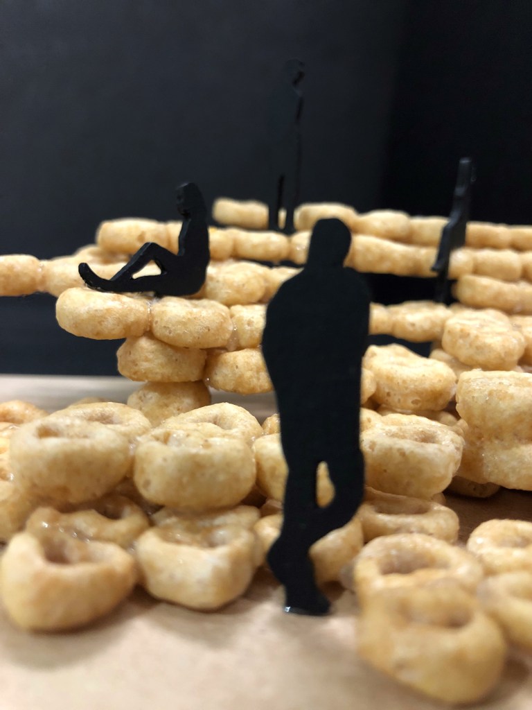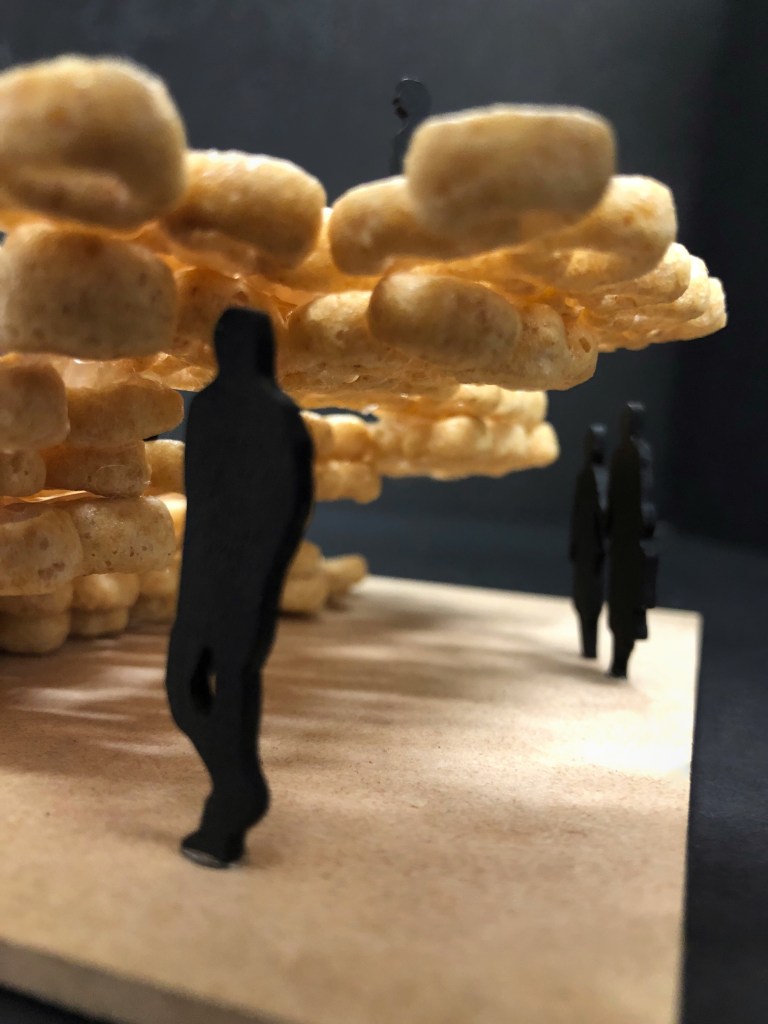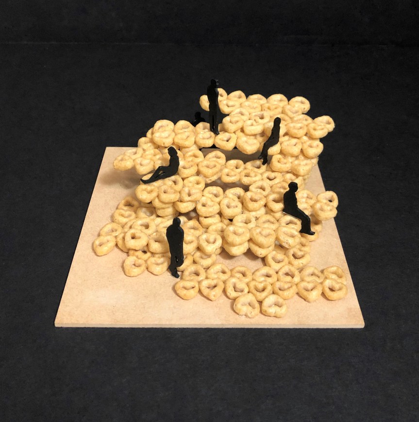Cheerios Model Process : In my study models I used two different shapes of this material: the heart shaped cheerios and the circled ones. I ended up with using the heart shaped ones. I was connecting and stacking the pieces in a way that the resting, walking and exploring areas were created. These solution led me to the conclusion of the mix and overlap concepts.