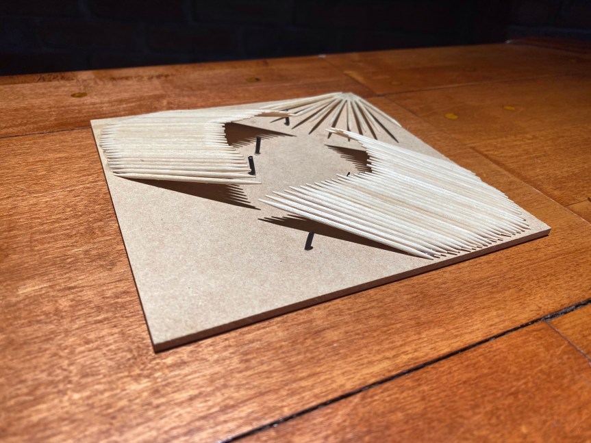 The main concept of this model was to use the toothpicks to create a surface that emerged from the ground level into a space that would be a canopy and users.