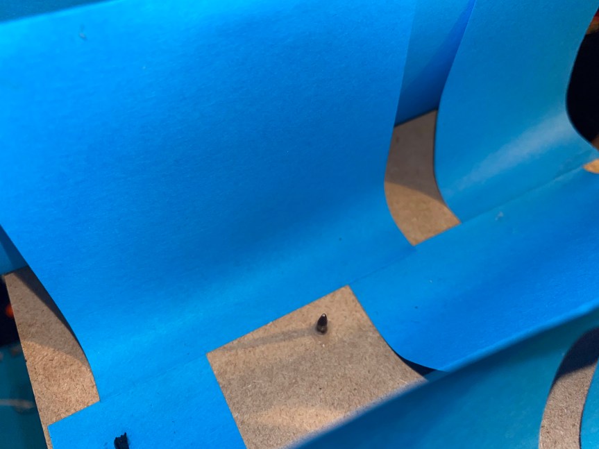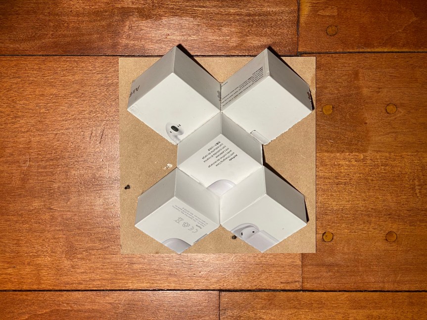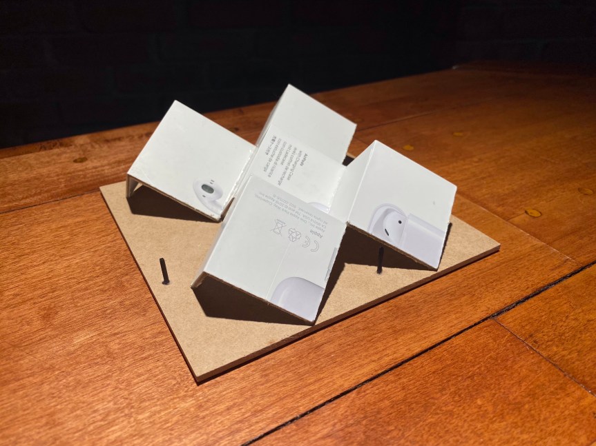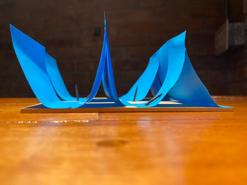 Using cut up pieces of an old box, slanting them and repeating across the 6″x6″ site, I was able to work with the concept of merging multiples of the same space under the same roof to create a sense of “rooms” without using walls or doors.