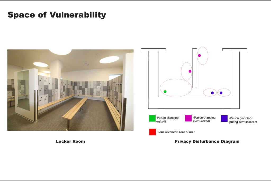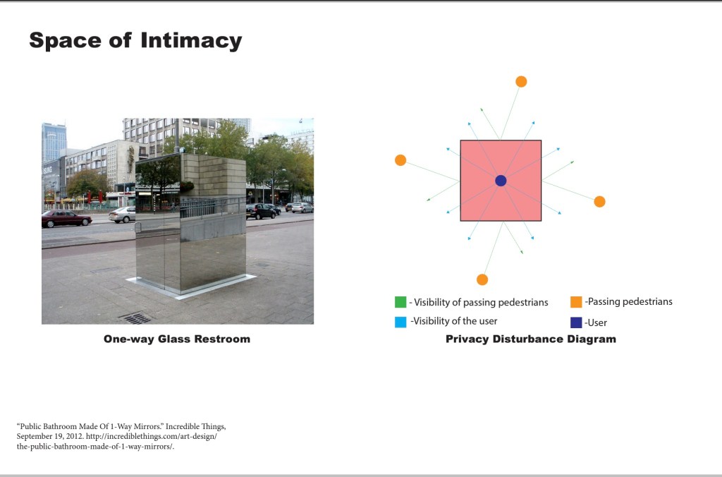 privacy from the public to be worth talking about. The user feels as if anyone can look into the restroom and observe what they could be doing while from the public, there are only just mirrors and has no way of actually seeing into the space.