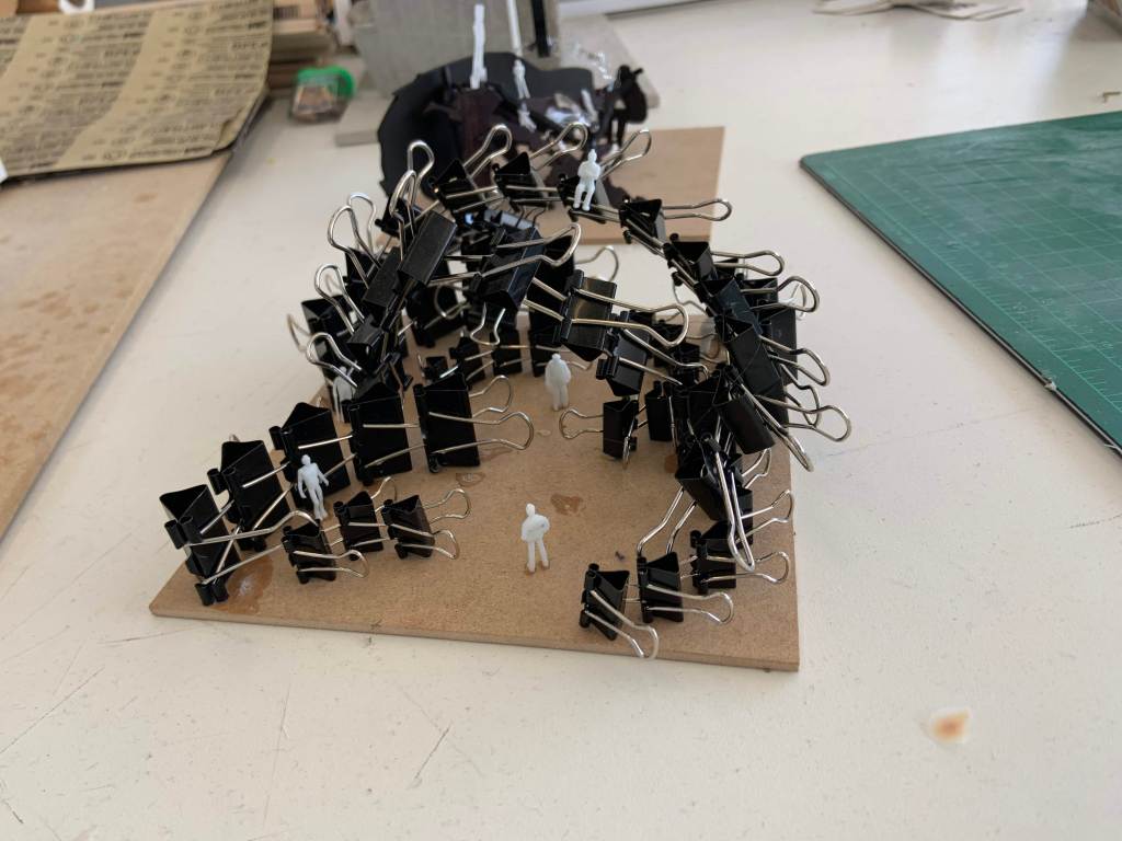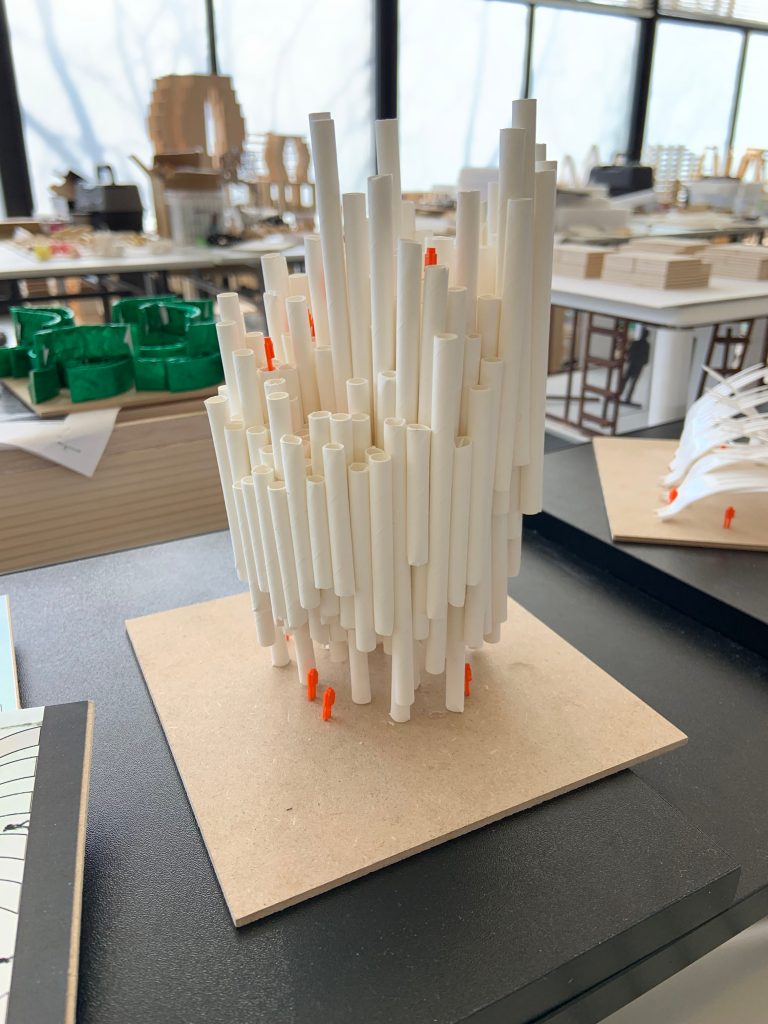 – The straw model from phase 3, as you pointed out, interesting in the inhabited surface but to me also because that surface has a ghost “tell” on the opposite side: the making of the upper surface affects the space at the bottom. I also think worth mining the idea of the straws themselves as inhabitable, like your cups. What if you diagrammed a cluster of small objects/spaces shaped in such a way as to create a larger surface or space and secondarily creating another space on the opposite side?