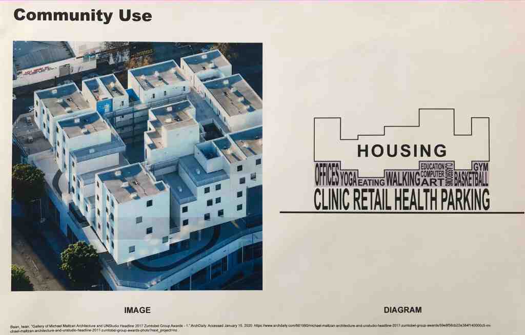 RESIDENTIAL, RETAIL, PARKING, TRANSPORTATION, CULTURAL ENTERTAINMENT (DANCE, MUSIC, THEATRE, ART), SOCIAL SERVICES, URBAN FARMING & GREENSPACE, ACTIVITY & HEALTH( FITNESS , ATHLETIC COURTS)