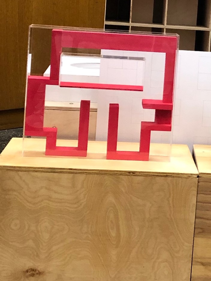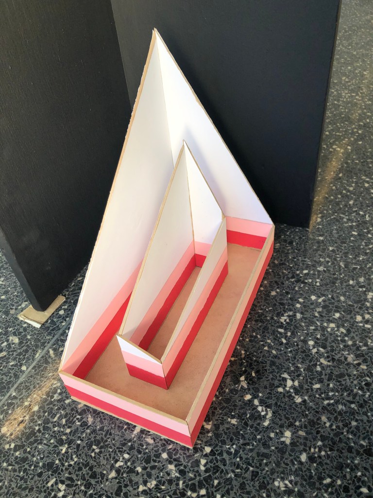 The triangles placed at different angles create stairs on the outside and inside connecting the people with the interior and exterior. People can also use the stairs as place to sit and socialize. The L shaped pieces start forming spaces on its own. It shows the movement of people in the whole area. The egg shells create a weaving for the movement of people.