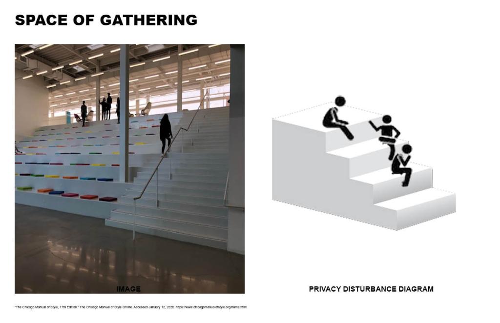 The Space provides privacy for students to study. The use of stairs for socializing is interesting. People can give lectures or speeches standing down and the audience will be sitting on the stairs. The space provides semi-privacy. The kitchen and living room being the most interactive spaces in a house are partially separated.