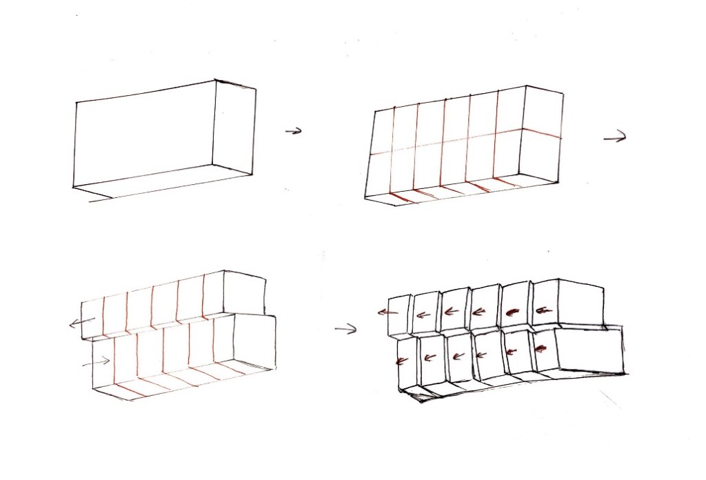 The parts of the building façade are set to varying sizes and depths to enhance the play of light across the surface.