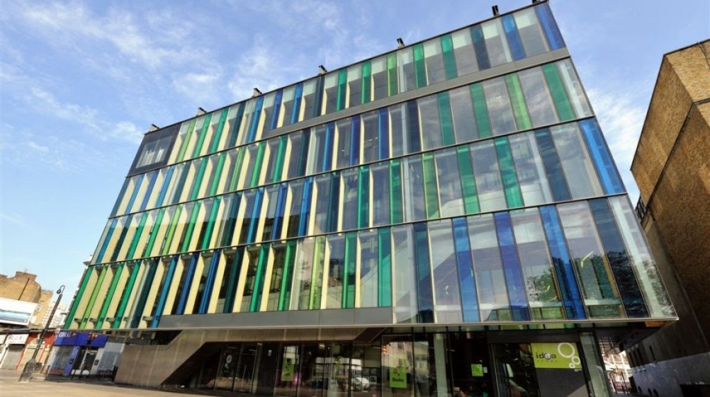 The building has five-story glazed facade that is striped, alternating laminated green, blue and clear glass that creates an interesting play of light.