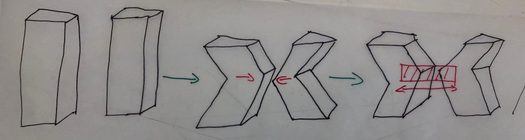This diagram demonstrates how the buildings form is created; the building starts as two towers thats shift in and there is a sky bridge that connects both structures.