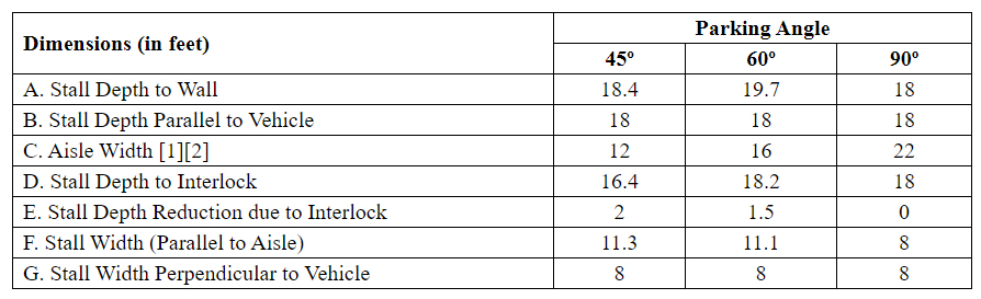 [1] Aisle width standards for parking angles of 90º may be reduced to 20 feet when parking stall width is increased to 8.5 feet.