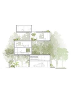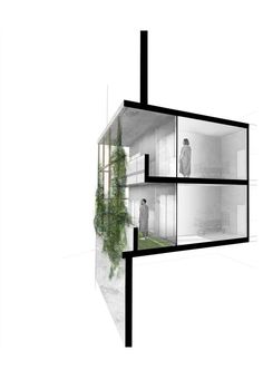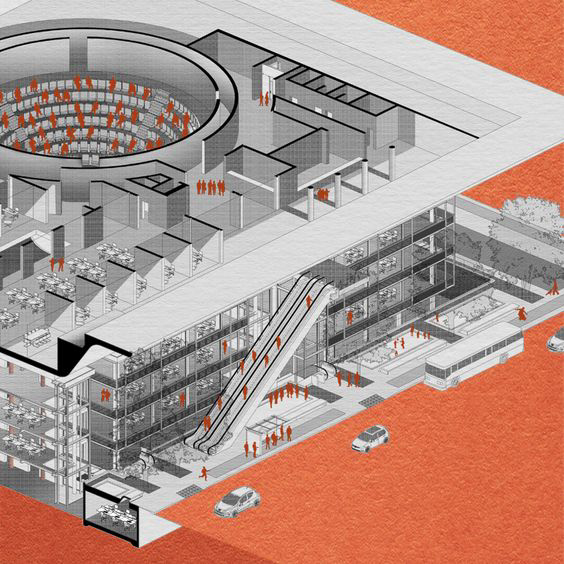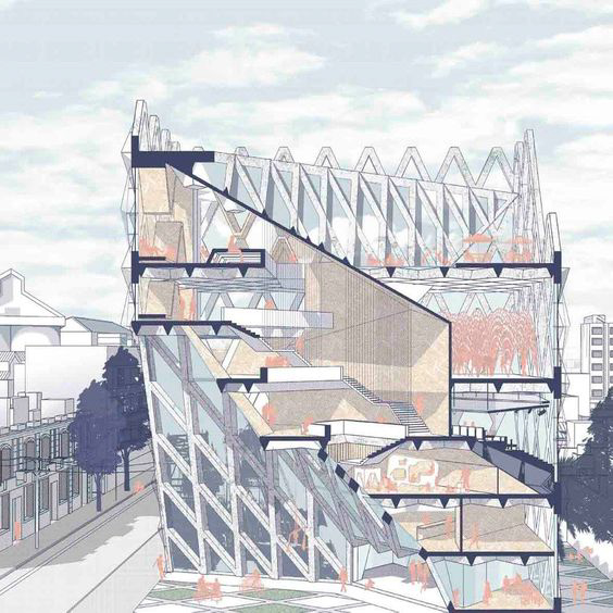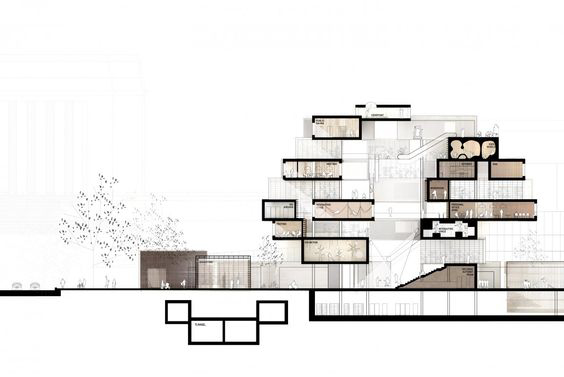 Instead of a true orthographic section with a one-point perspective, a 2-point perspective view with part of your building cut away as a section.